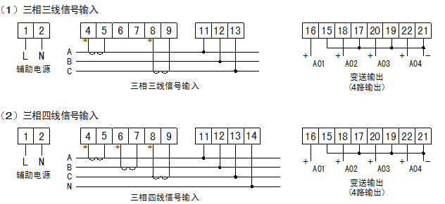 輸入三相電壓、電流信號(hào),隔離變送輸出四路模擬量信號(hào),對(duì)應(yīng)有功功率、無(wú)功功率和其它電量可選。